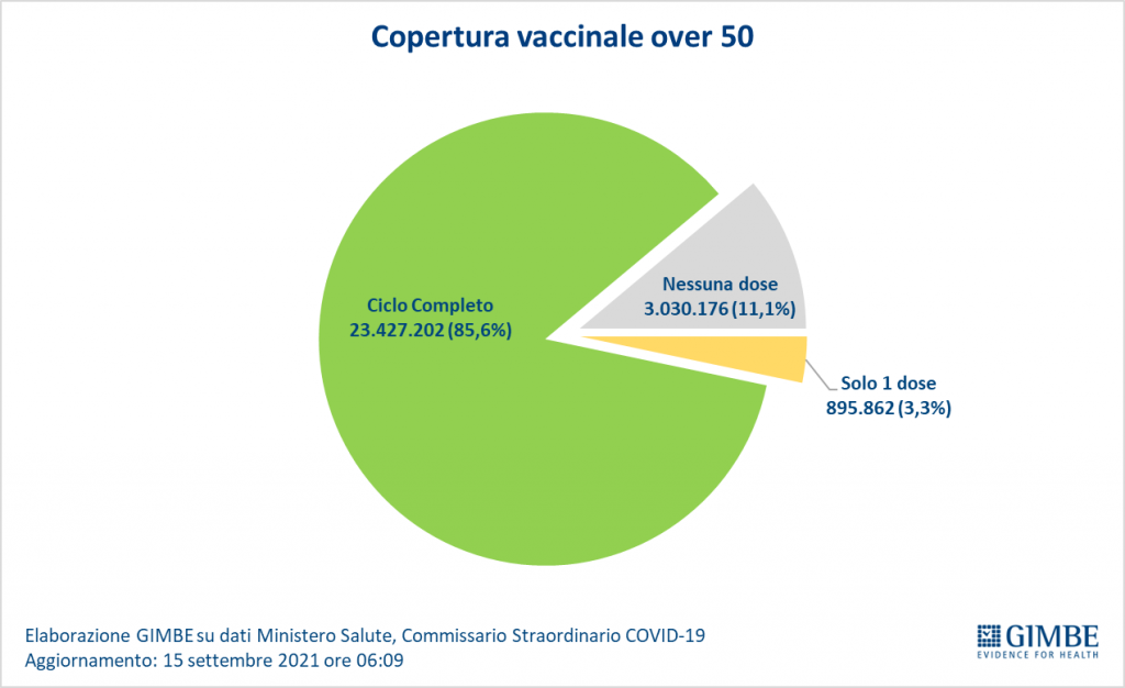 Ad aver ricevuto almeno una dose di vaccino è invece l’88,9% della popolazione over 50 (+0,5% rispetto alla settimana precedente) con nette differenze regionali: dal 93,3% della Puglia all’83% della Calabria.