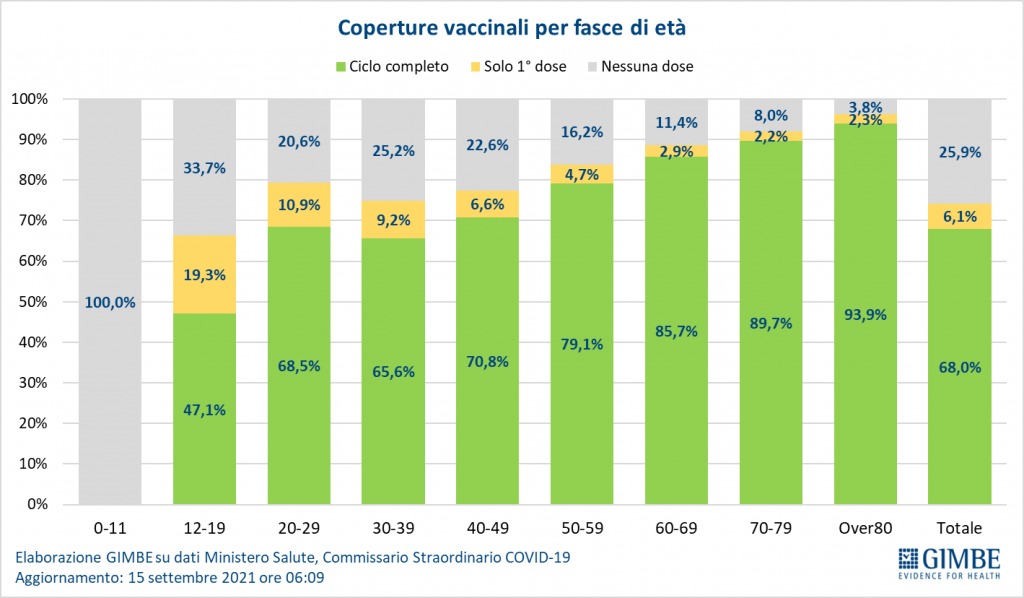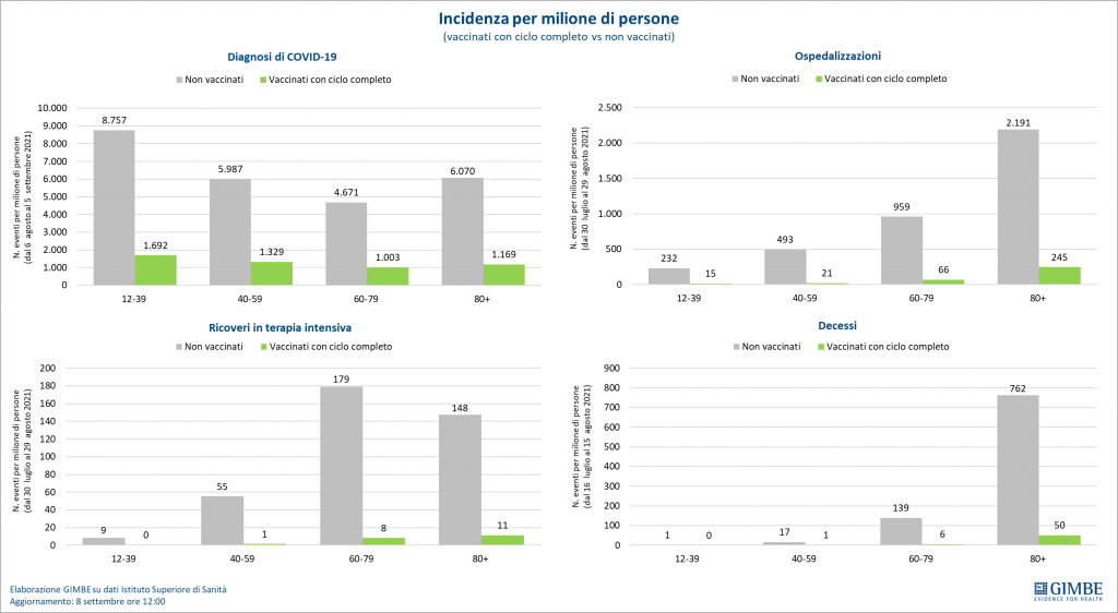 «Questo conferma – spiega Nino Cartabellotta, presidente della Fondazione Gimbe – che durante il periodo estivo tra i più giovani deve aver influito l’incremento dei contatti sociali e la minore attenzione ai comportamenti individuali, fondamentali per prevenire il contagio anche nelle persone vaccinate». Nei soggetti vaccinati con ciclo completo, rispetto ai non vaccinati, si registra un netto calo dell’incidenza di diagnosi e soprattutto di malattia severa che porta ad ospedalizzazione, ricovero in terapia intensiva o decesso: nelle varie fasce di età, le diagnosi di SARS-CoV-2 si riducono infatti del 77,8-80,7%, i ricoveri ordinari dell’88,8-95,6%, quelli in terapia intensiva del 92,5-97,4% e i decessi del 93,4-100%.